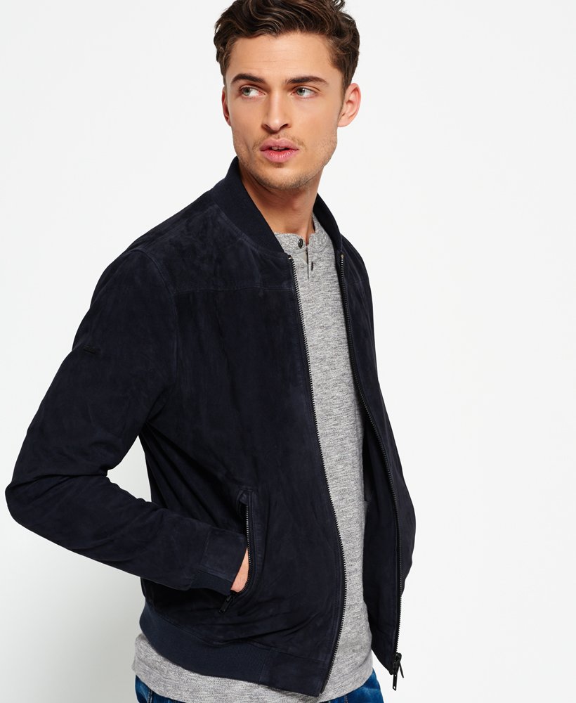 Superdry men’s slim suede bomber. A premium quality goat suede bomber style jacket, featuring a ribbed collar, two zipped front pockets and a front zip fastening. Inside, the jacket is fully lined and has a single breast pocket with popper fastening. The slim suede bomber jacket is finished with a subtle metal Superdry logo one sleeve, and a zipped pocket on the other.