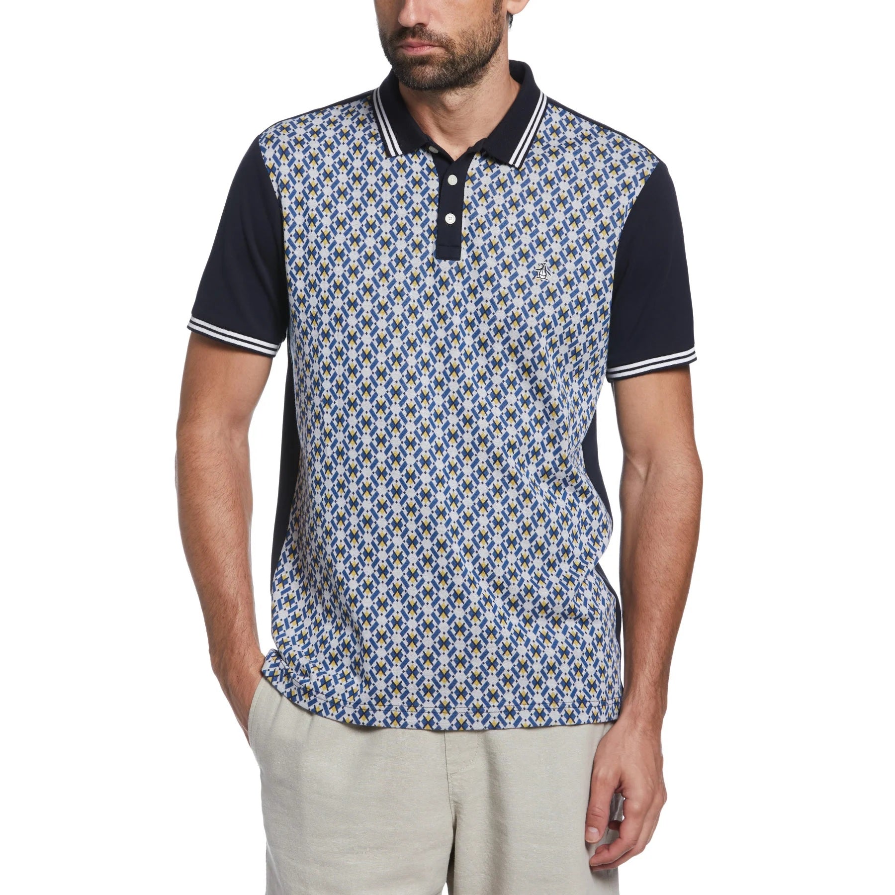 A jacquard front panel featuring an overlapping diamond pattern adds plenty of energy to the design of this men’s polo top from Original Penguin. The comfortable men’s short sleeve shirt has a contrasting ribbed and tipped collar, with matching tipped cuffs for a clean, defined look. Our buddy Pete the penguin appears on the chest in sticker logo form, adding an eye-catching finishing touch.